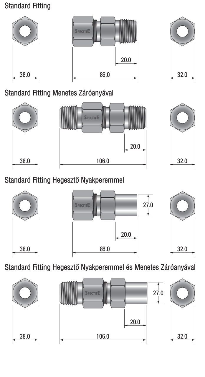 | Standard Fitting egy menetes folyamatcsatlakozással. | Lehetővé teszi hogy a szerelvényt a folyamatunk ellentétes oldalán menetesen rögzítsük pl. csatlakozófejhez vagy csőbe. | Menet nélkül is szállíthatjuk, hegesztéssel történő állandó beépítéshez. A rendelési kódban a menetméretnél a 'WELD' szót kérjük feltüntetni. | A beszereléshez illesztő karimához való csatlakoztatáshoz, see Perem Részletei s for details of the flanges available as standard. |