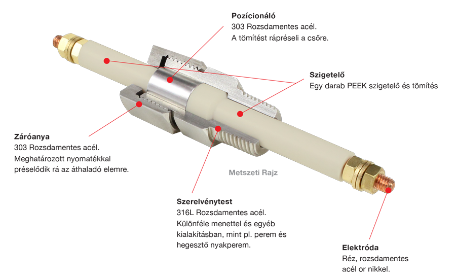 - 316L Rozsdamentes acél test, 303 belső pozícionáló és anya; PEEK szigetelő