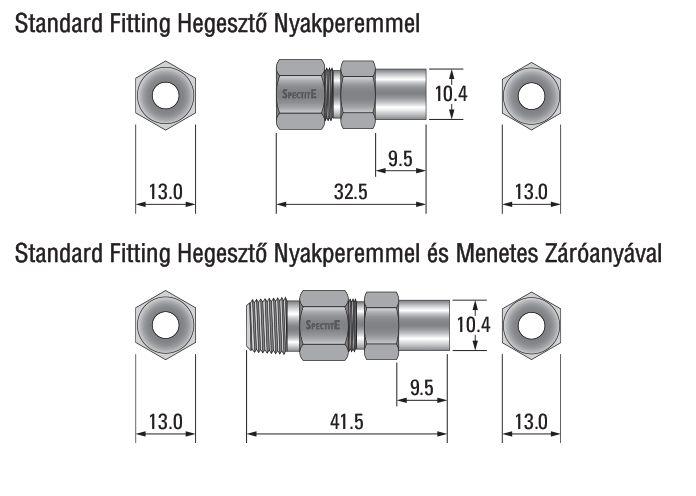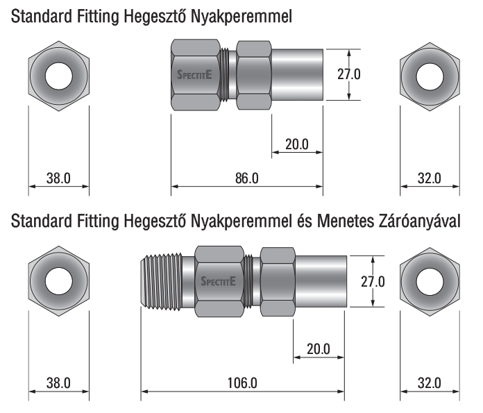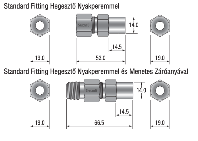 | Standard Fitting egy menetes folyamatcsatlakozással. | Lehetővé teszi hogy a szerelvényt a folyamatunk ellentétes oldalán menetesen rögzítsük pl. csatlakozófejhez vagy csőbe. |