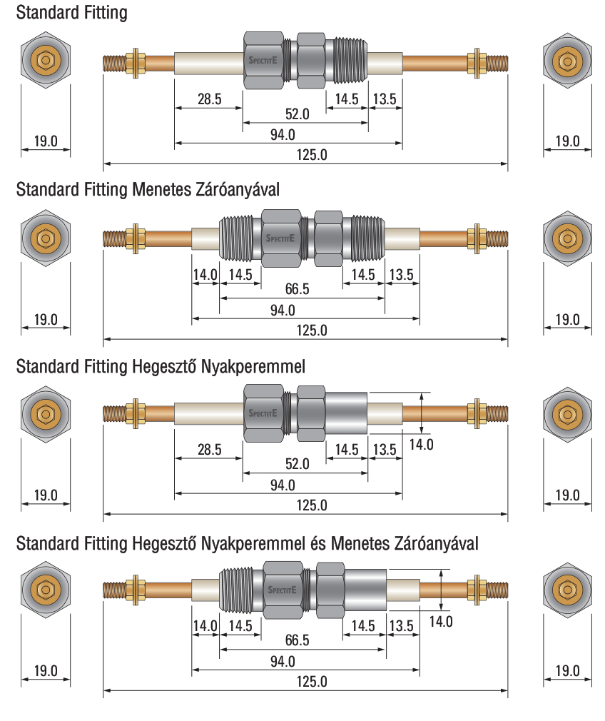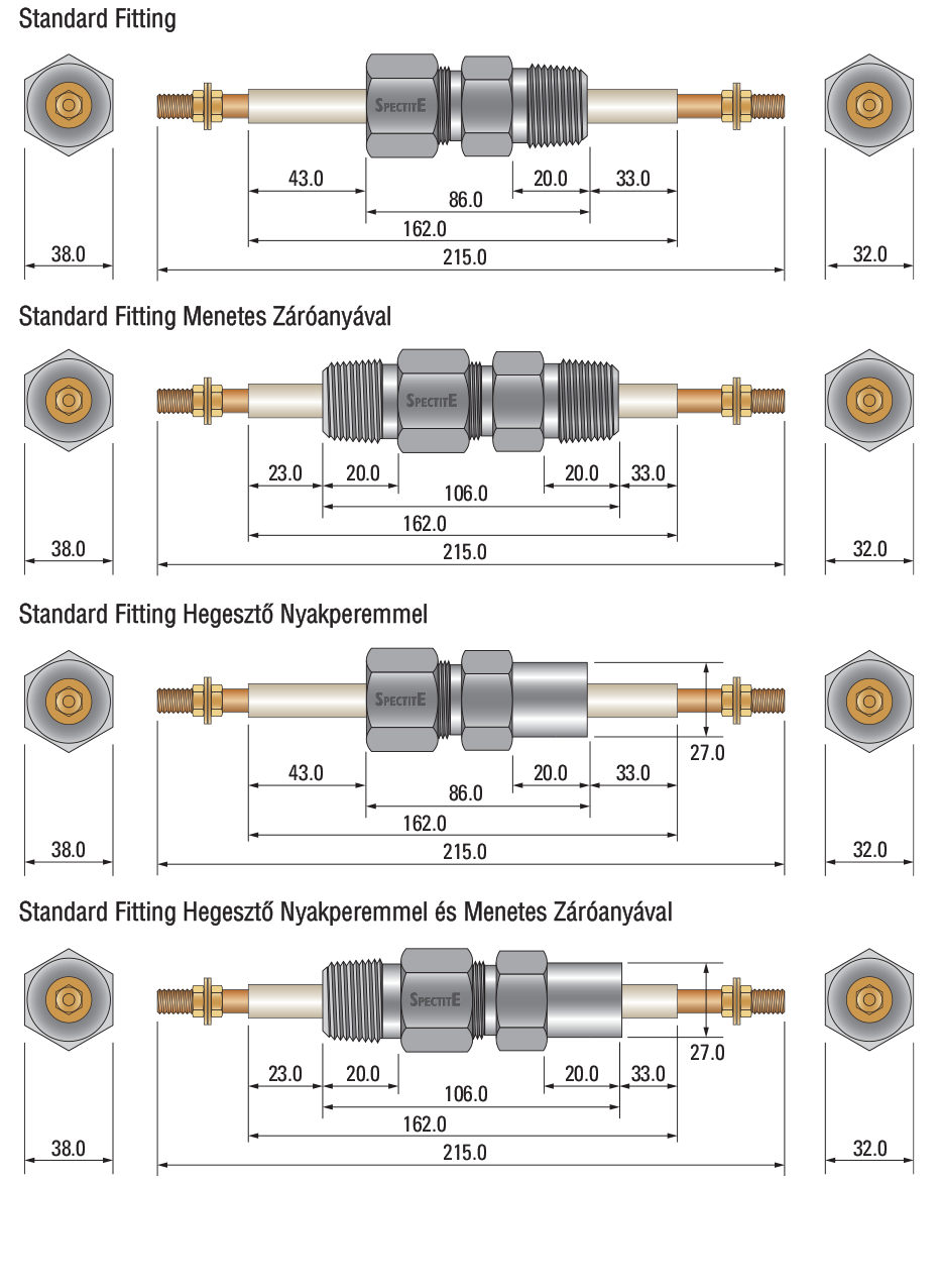 | 2-ás Méret (1/4" vagy azzal egyenértékű Menet) | 3-ás Méret (1/2" vagy azzal egyenértékű Menet) | 4-ás Méret (3/4" vagy azzal egyenértékű Menet) | |||