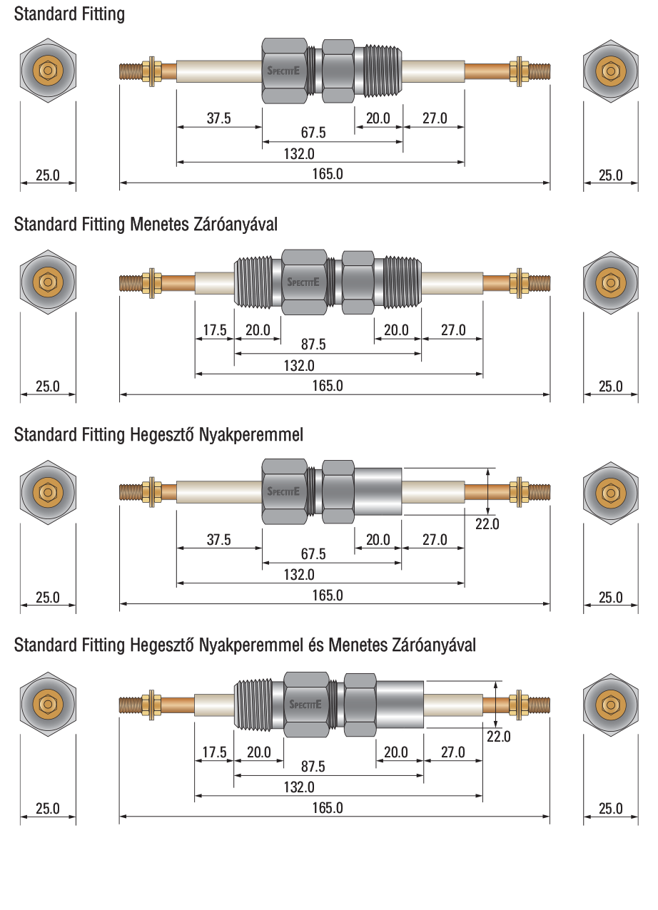 Standard Fitting B Kialakítású menetes záróanyával védőcsőbe/csatlakozófejbe vagy tokozatba való csatlakozáshoz. A menet a folyamatcsatlakozással megegyező, hacsak másképp nincs megadva. Eltérő menet igénye esetén a ‘B’ betű után kérjük megadni, pl.: Ha B anya hegesztő peremmel együtt van, akkor a menetet kérjük megadni. |