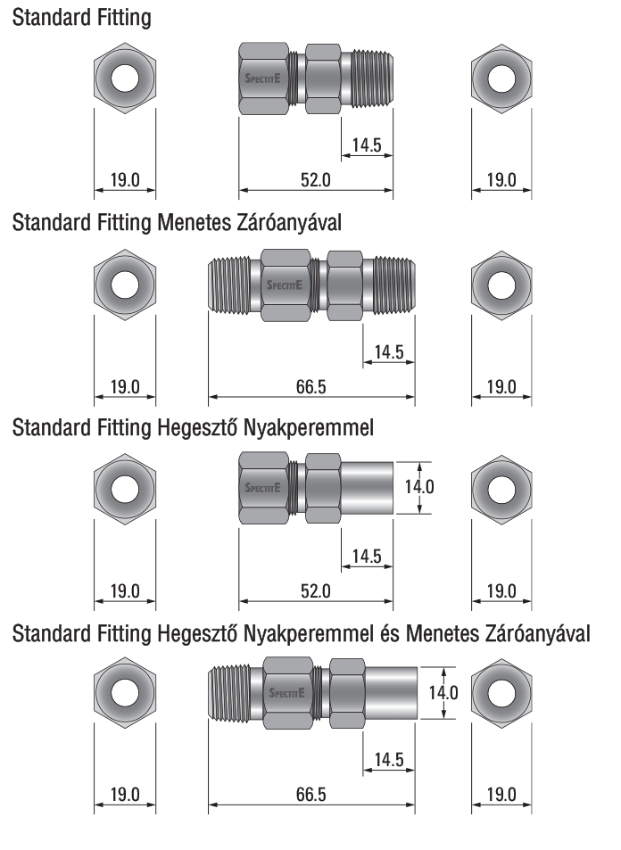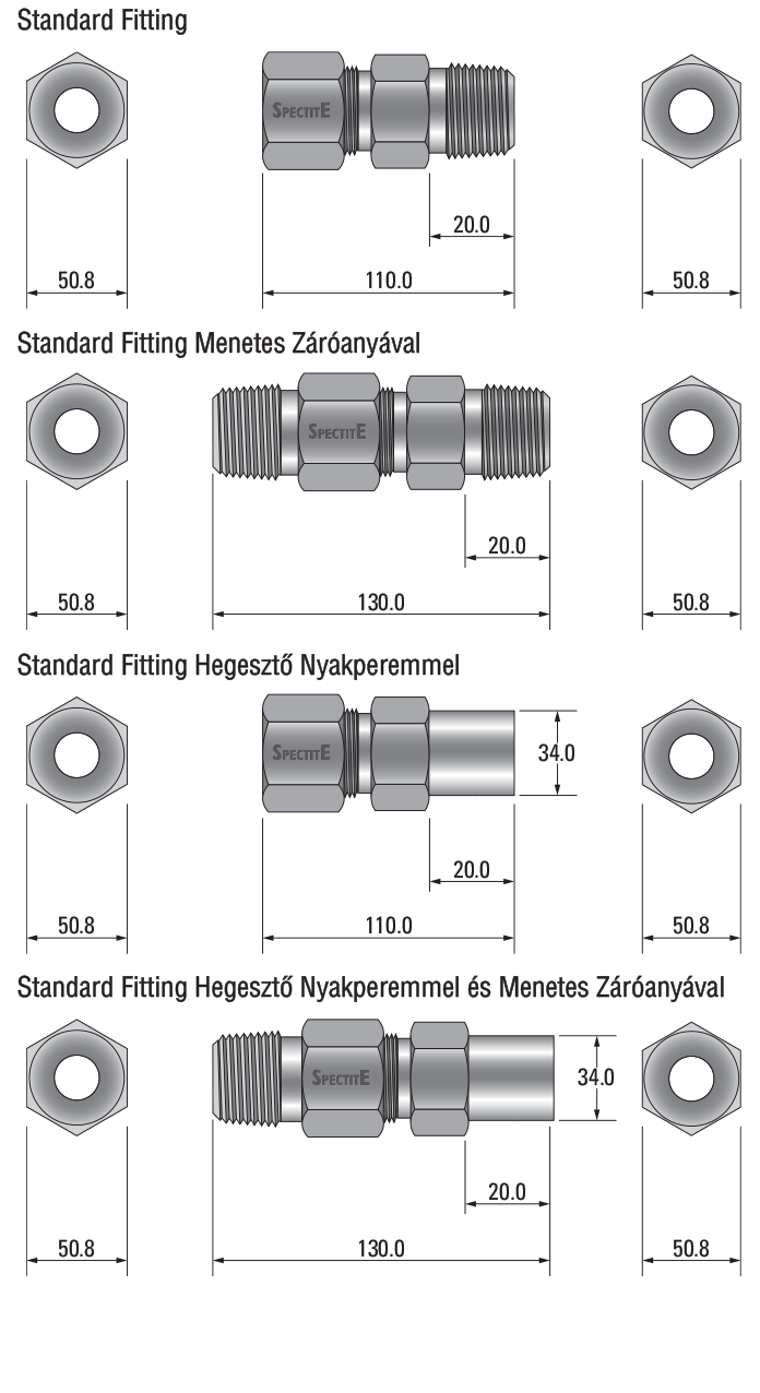 | Standard Fitting egy menetes folyamatcsatlakozással. | Lehetővé teszi hogy a szerelvényt a folyamatunk ellentétes oldalán menetesen rögzítsük pl. csatlakozófejhez vagy csőbe. | Menet nélkül is szállíthatjuk, hegesztéssel történő állandó beépítéshez. A rendelési kódban a menetméretnél a 'WELD' szót kérjük feltüntetni. | A beszereléshez illesztő karimához való csatlakoztatáshoz, see Perem Részletei s for details of the flanges available as standard. |