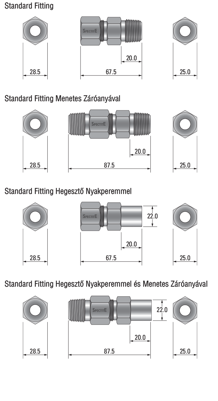 Standard Fitting B Kialakítású menetes záróanyával védőcsőbe/csatlakozófejbe vagy tokozatba való csatlakozáshoz. A menet a folyamatcsatlakozással megegyező, hacsak másképp nincs megadva. Eltérő menet igénye esetén a ‘B’ betű után kérjük megadni, pl.: Ha B anya hegesztő peremmel együtt van, akkor a menetet kérjük megadni. |