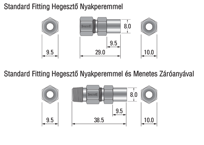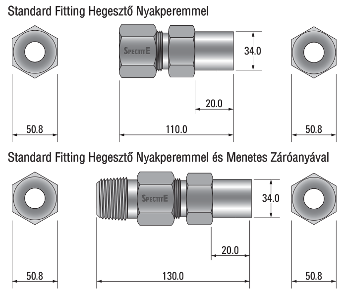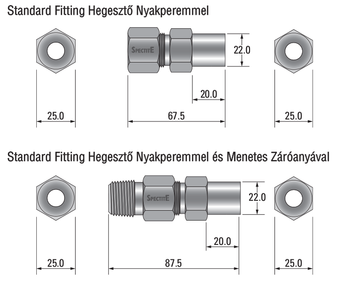 | Standard Fitting egy menetes folyamatcsatlakozással. | Lehetővé teszi hogy a szerelvényt a folyamatunk ellentétes oldalán menetesen rögzítsük pl. csatlakozófejhez vagy csőbe. |